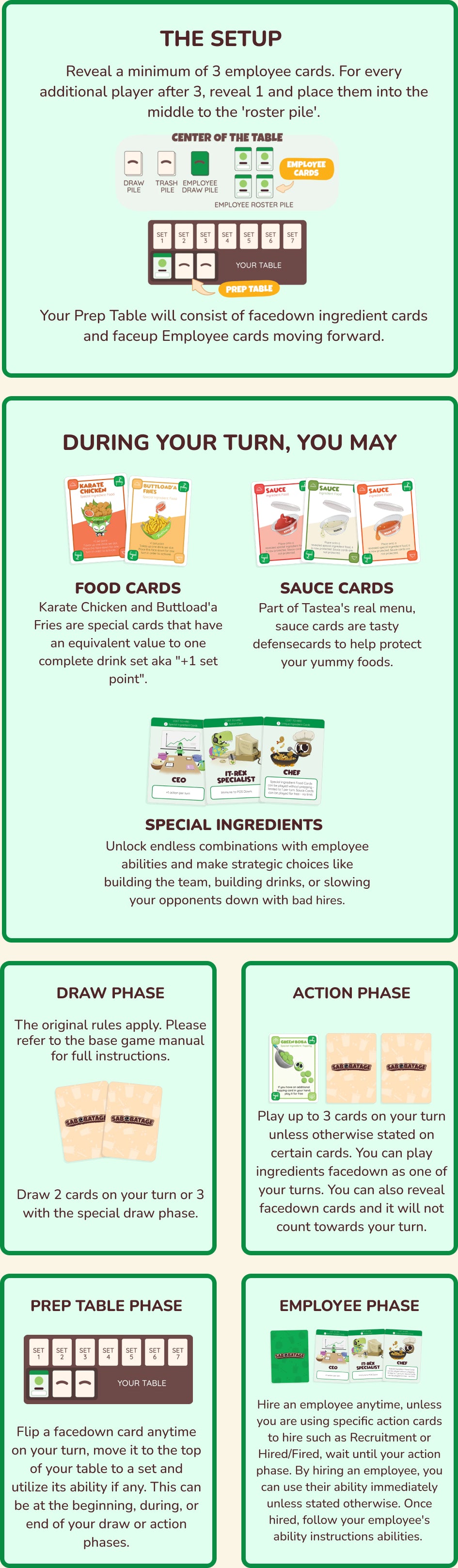 Tastea friends join the Sabobatage universe in this brand new expansion pack introducing new mechanics that enhance gameplay. A new draw pile called the Employee Roster - allows the hiring of employees across the board allowing their special abilities to help you in your goal of building 5 boba drinks!